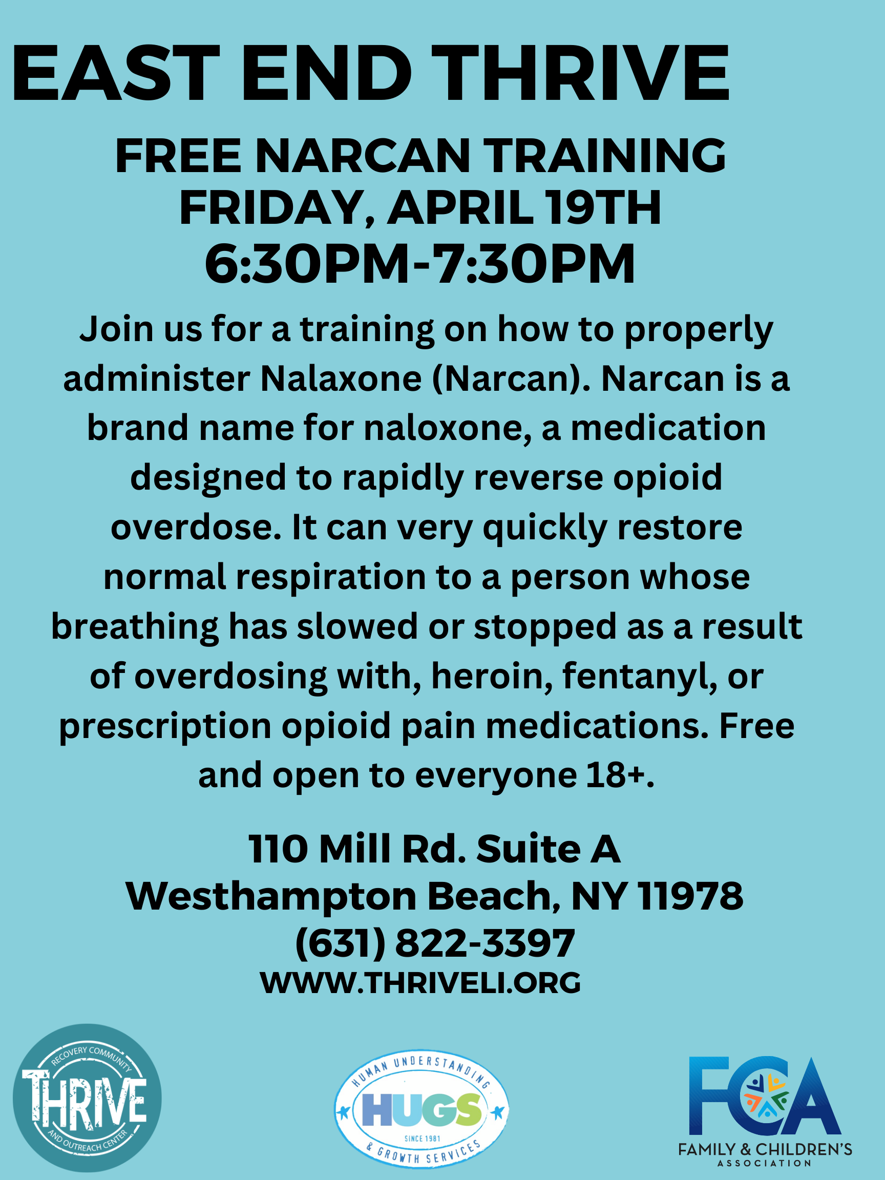 Unfortunately, tonight’s Narcan training at East End THRIVE has been postponed. We will inform all who registered of our next offering. Thank you for your understanding.