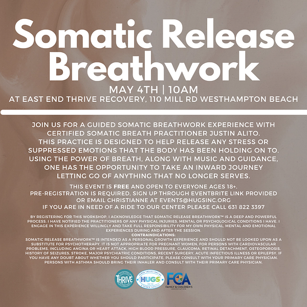 Join us for a guided Somatic Release Breathwork experience with certified Somatic Release Breathwork practitioner, Justin Alito. This practice is designed to help release any stress or suppressed emotions that the body has been holding on to. Using the power of breath, along with music and guidance, one has the opportunity to take an inward journey, letting go of anything that no longer serves. This event is FREE and open to everyone ages 18+. Pre-registration is required, sign up through Eventbrite link provided here or email Christianne at events@hugsinc.org.